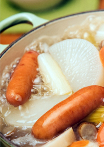 用香腸代替豬肉和牛肉比較簡單和健康。開始先品嘗湯汁,接著品嘗用薺菜粒和柚子胡椒佐味的美味香腸和蔬菜。