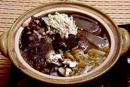 - 瓦鍋放入海帶和水。加上菇類和魔芋開火煮熟即可。